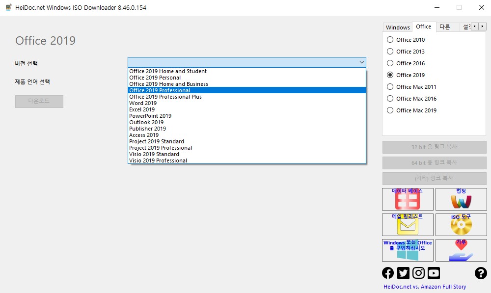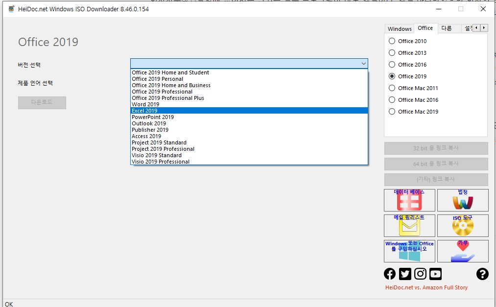 여섯째 나는 2019 엑셀 버전을 선택했고 제품 언어는 한국어를 선택했다.