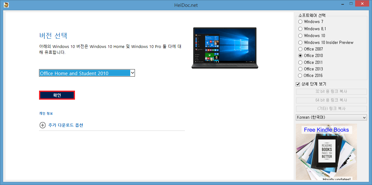 그러면 버전 선택의 화면이 나올 텐데 목록을 눌러 Office Home and Student 2010을 선택한 다음 밑에 [확인]을 눌러줍니다.