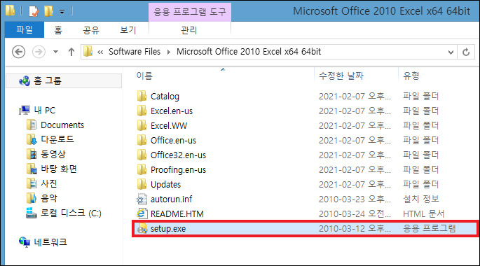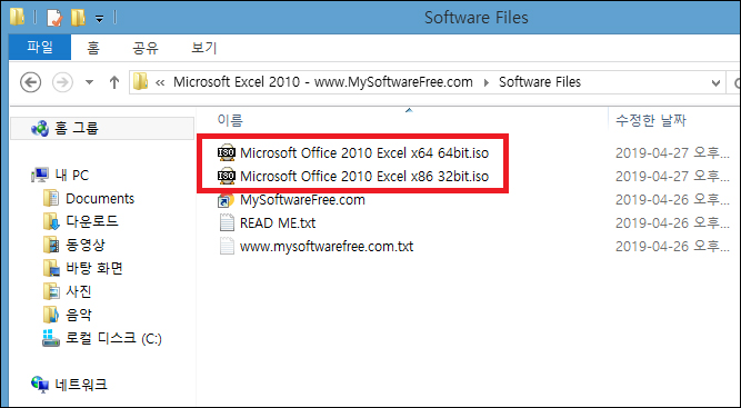 이후 www.MySoftwareFree.com의 폴더를 열고 Software Files 폴더로로 들어가면 PC 비트에 맞는 버전을 선택하여 추가적으로 압축 해제를 진행해야 될 것이며, setup 파일을 더블클릭 후 허용하여 실행하면 마이크로소프트 엑셀 2010 프로그램을 사용할 수 있습니다.