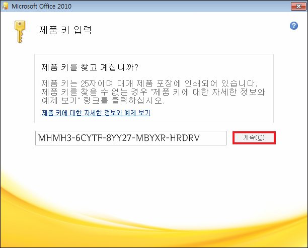 정상적으로 완료되면 압축 파일이 저장될 테니 파일을 더블클릭하여 압축 상태를 해제하면 될 것이며, 잠시 후 Microsoft Office 창이 열릴 텐데 제품 키(시리얼 번호)를 입력해야 되니 MHMH3-6CYTF-8YY27-MBYXR-HRDRV를 입력한 다음 [계속]을 눌러주세요.