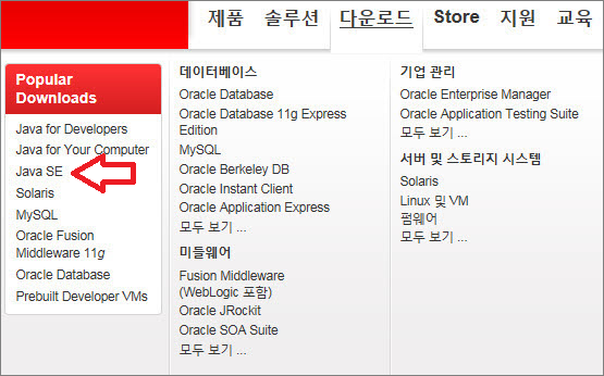 왼쪽 Popular Downloads 메뉴에 3번째 Java SE로 들어가세요.