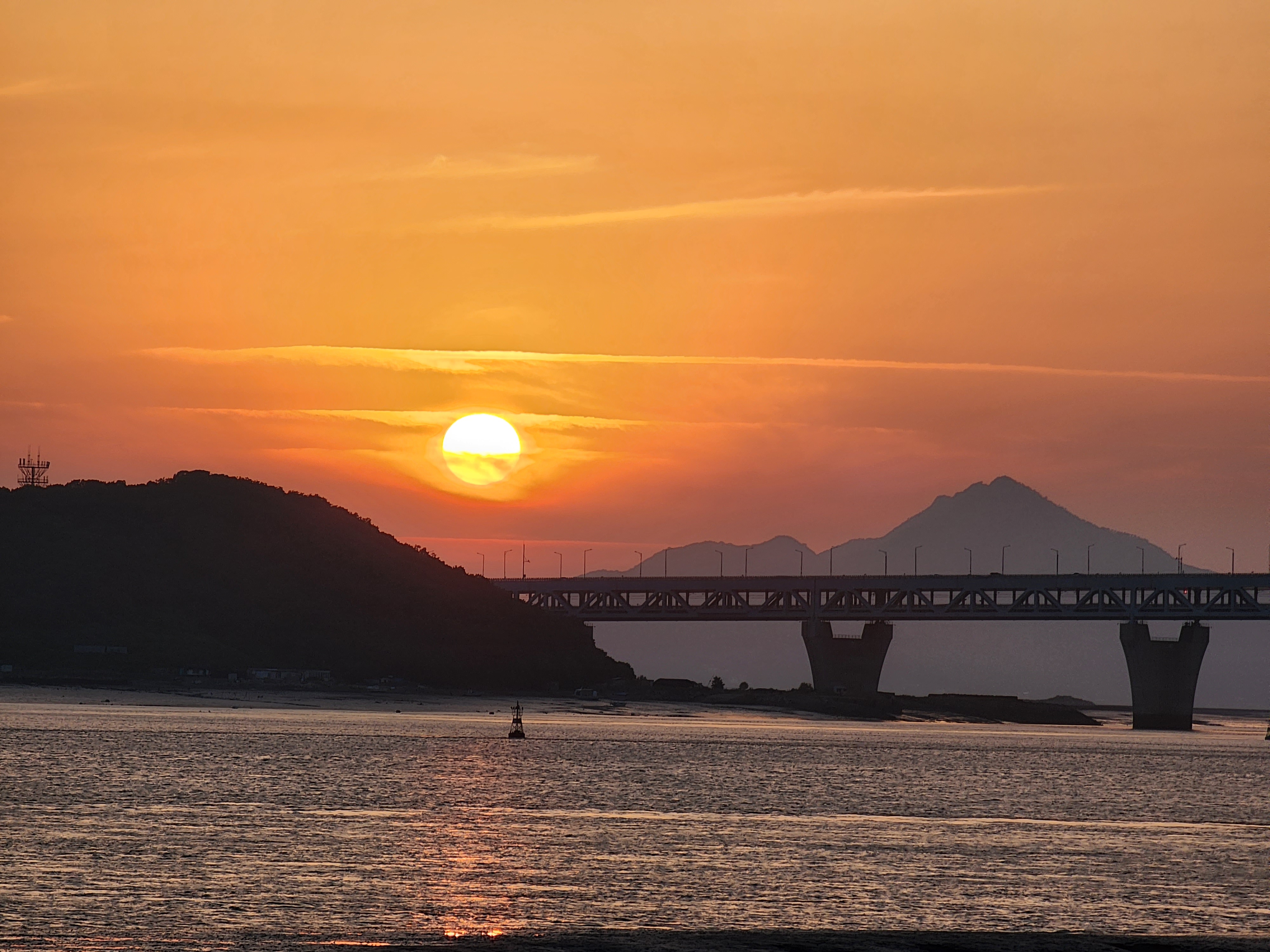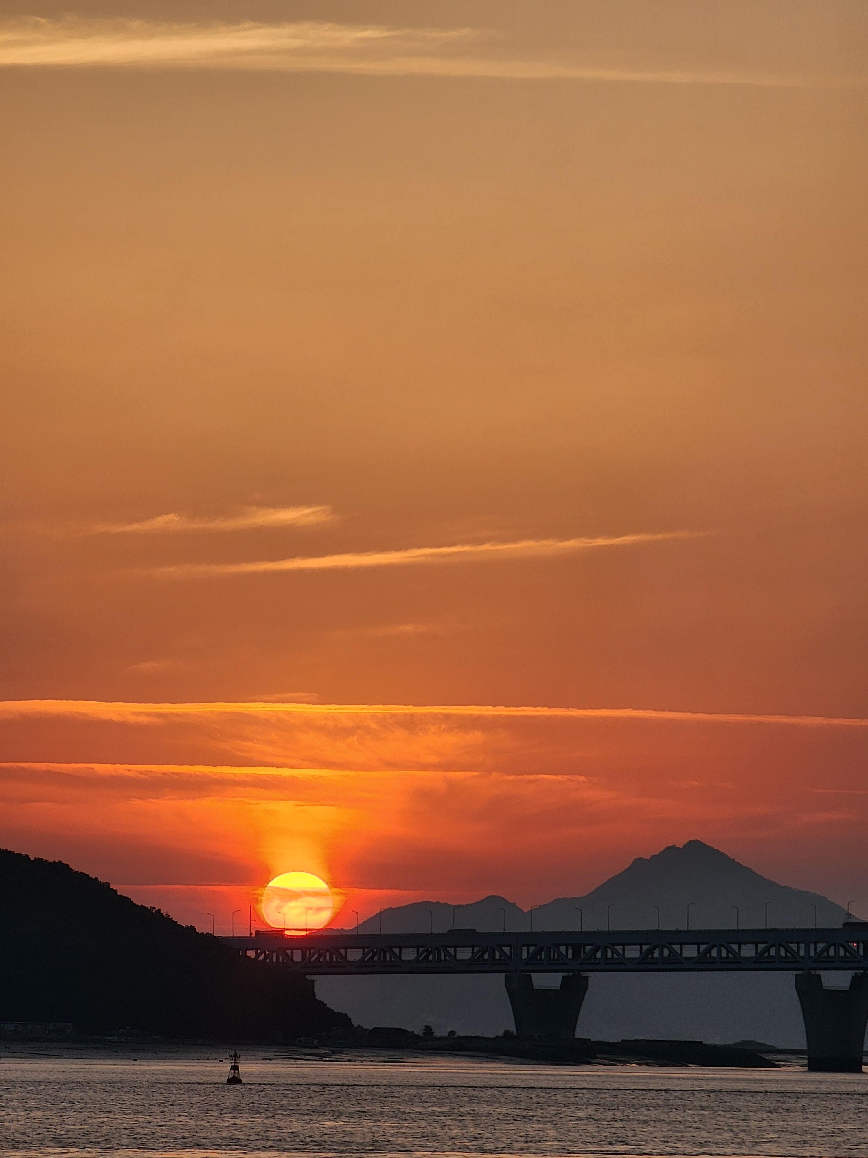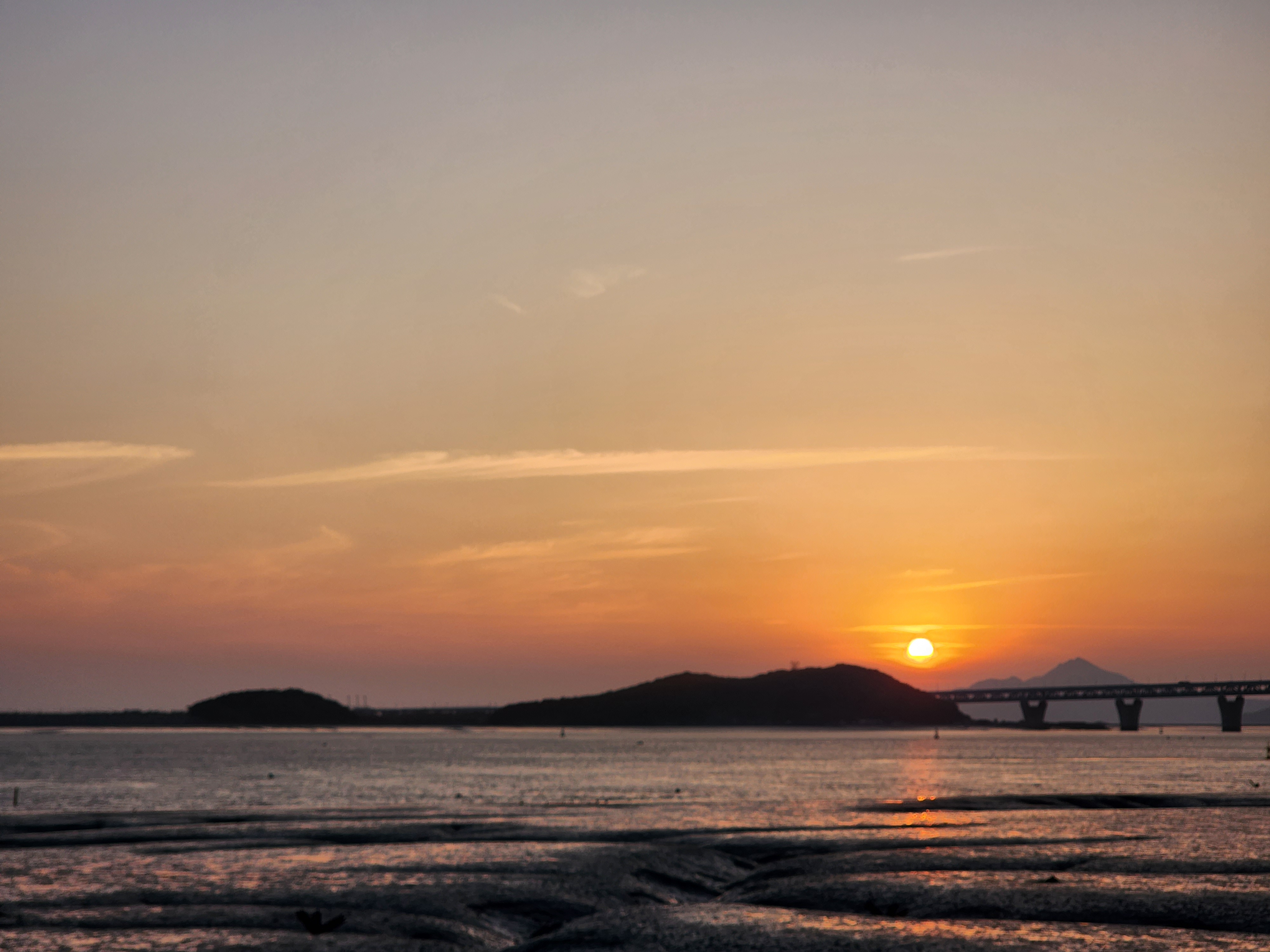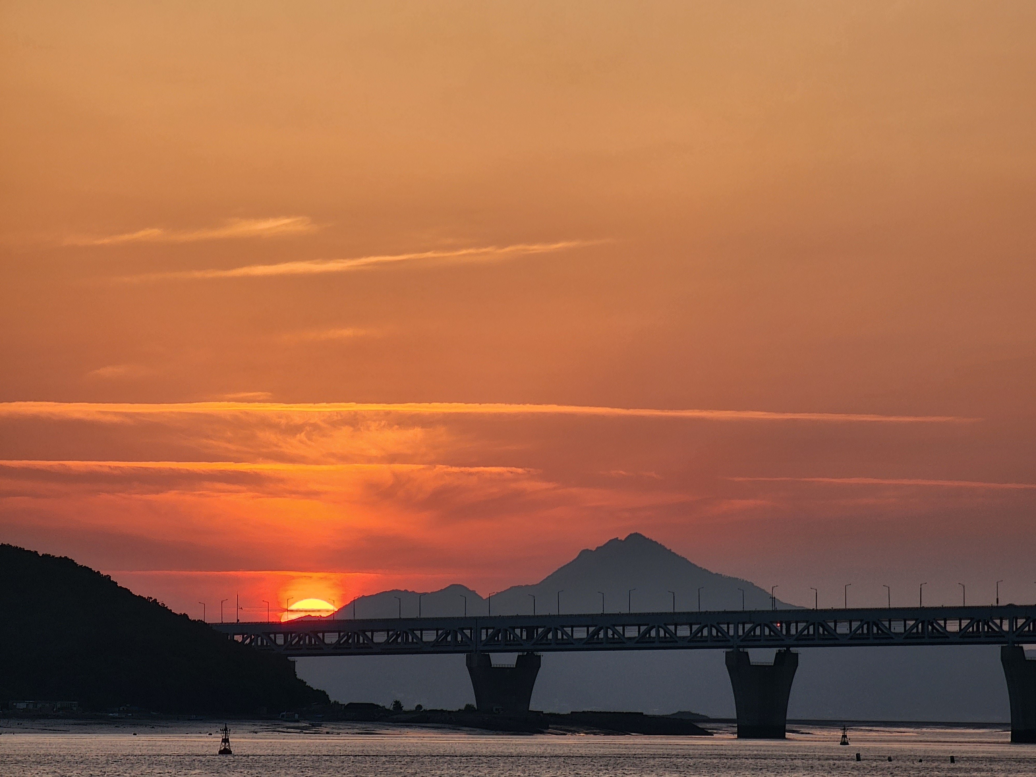 구름이 서해상을 마치 태극기처럼 펼치고 있습니다. 물결이 끓는 듯한 서해의 낙조 장면은 마치 둥근 원구가 검붉은 불덩이와 같이 눈에 쏙 들어옵니다. 해가 수평선 뒤로 접어들면서 큰 바퀴를 붙들며 서서히 잠기고, 먼 뒷섬들은 차츰 희미해지는 모습을 보입니다. 구름 빛도 서서히 가라앉고 섬들도 점점 그림자처럼 어둠에 잠기는데, 남기고 간 것은 환히 빛나던 수평선과 적막한 바다뿐입니다.