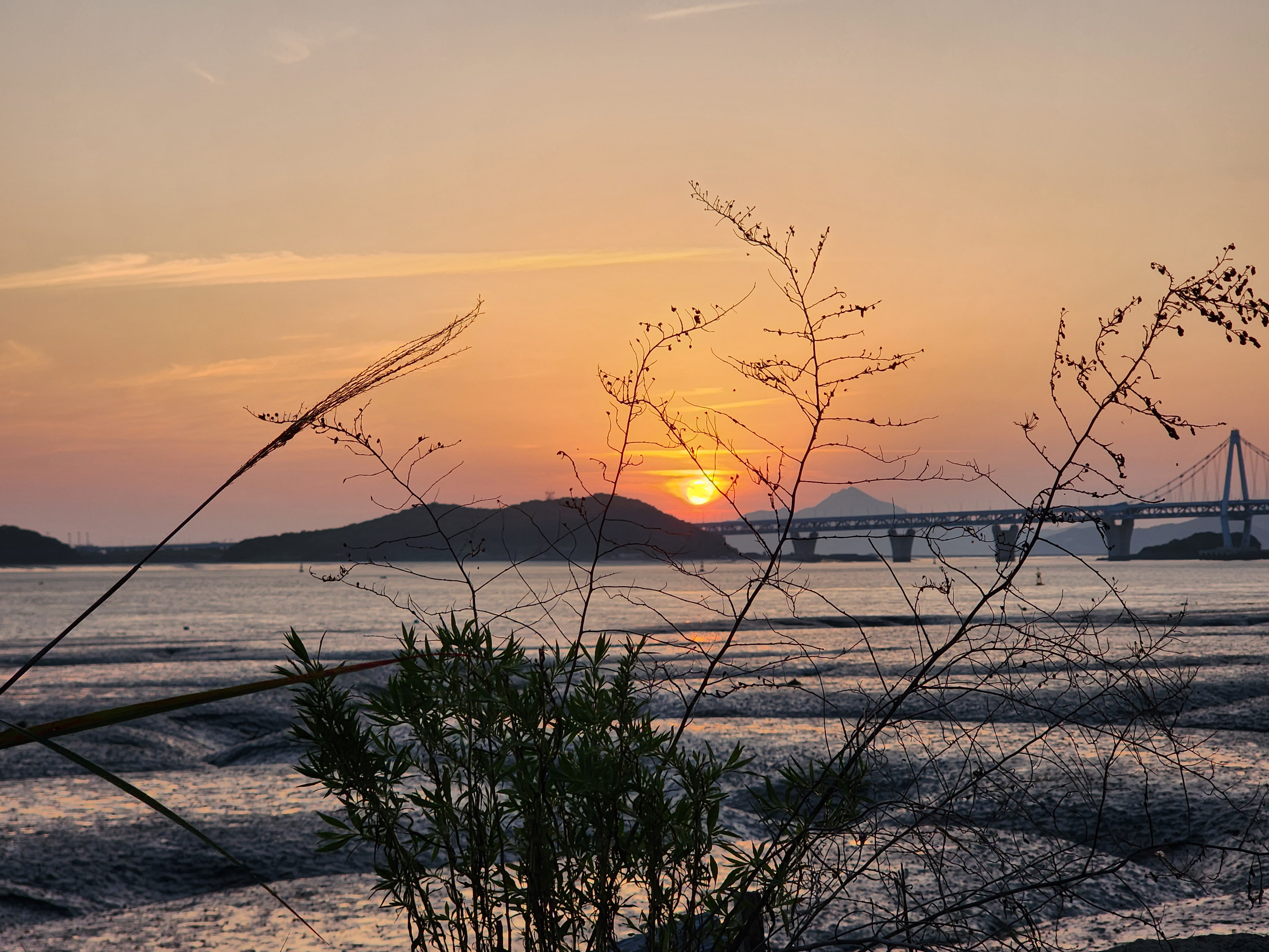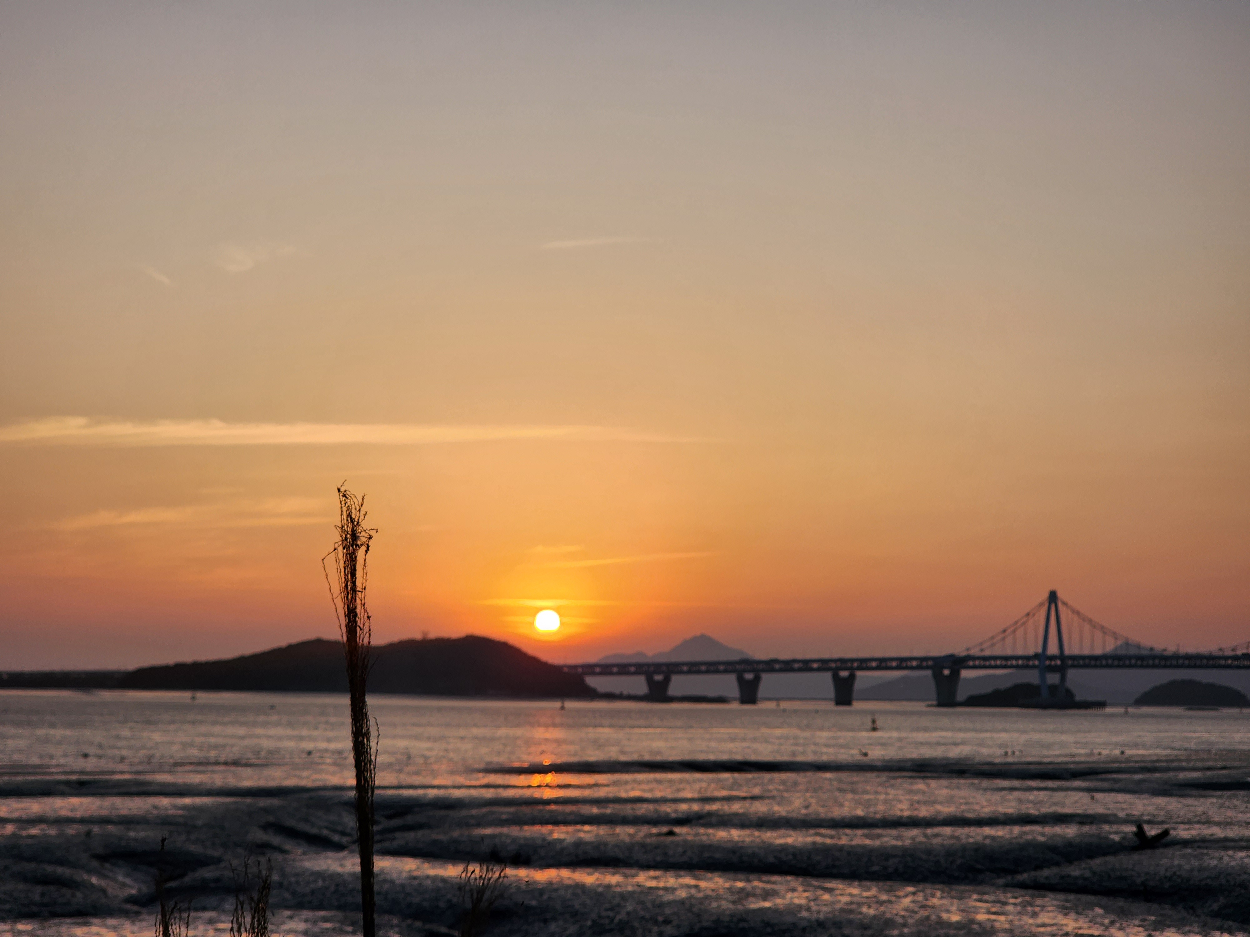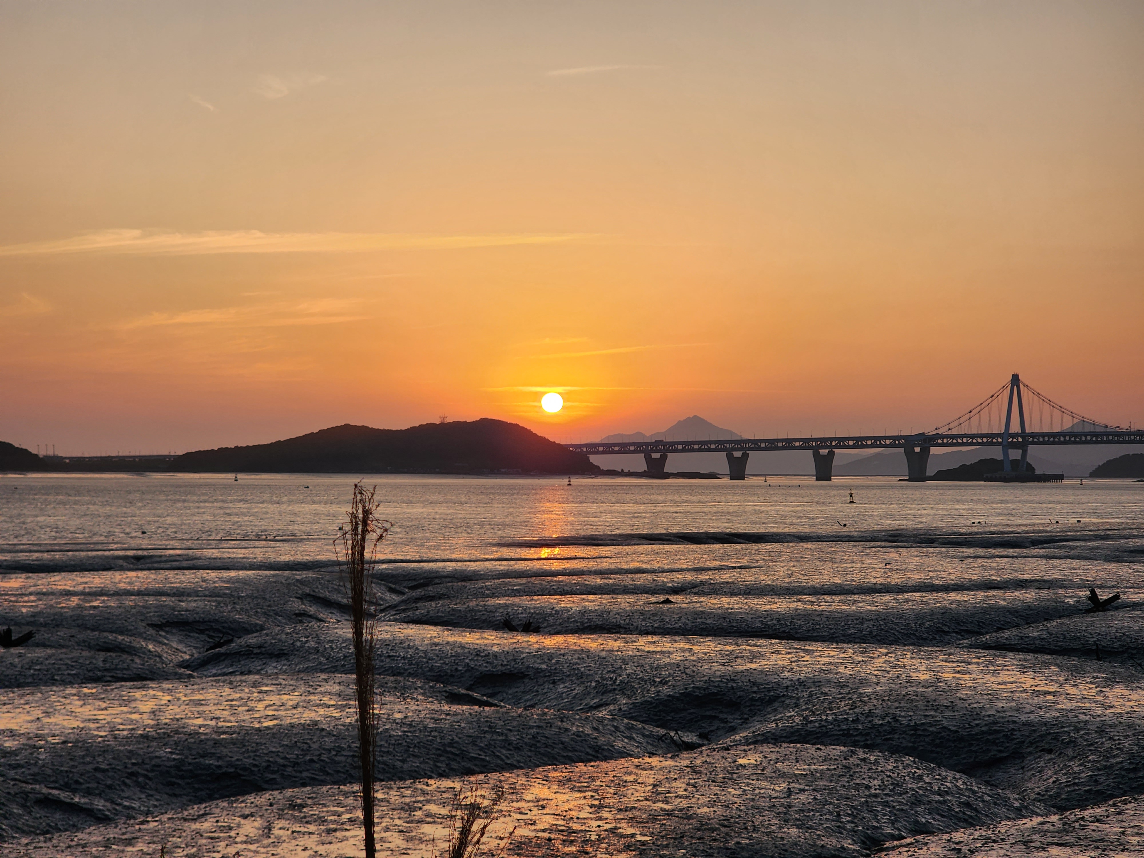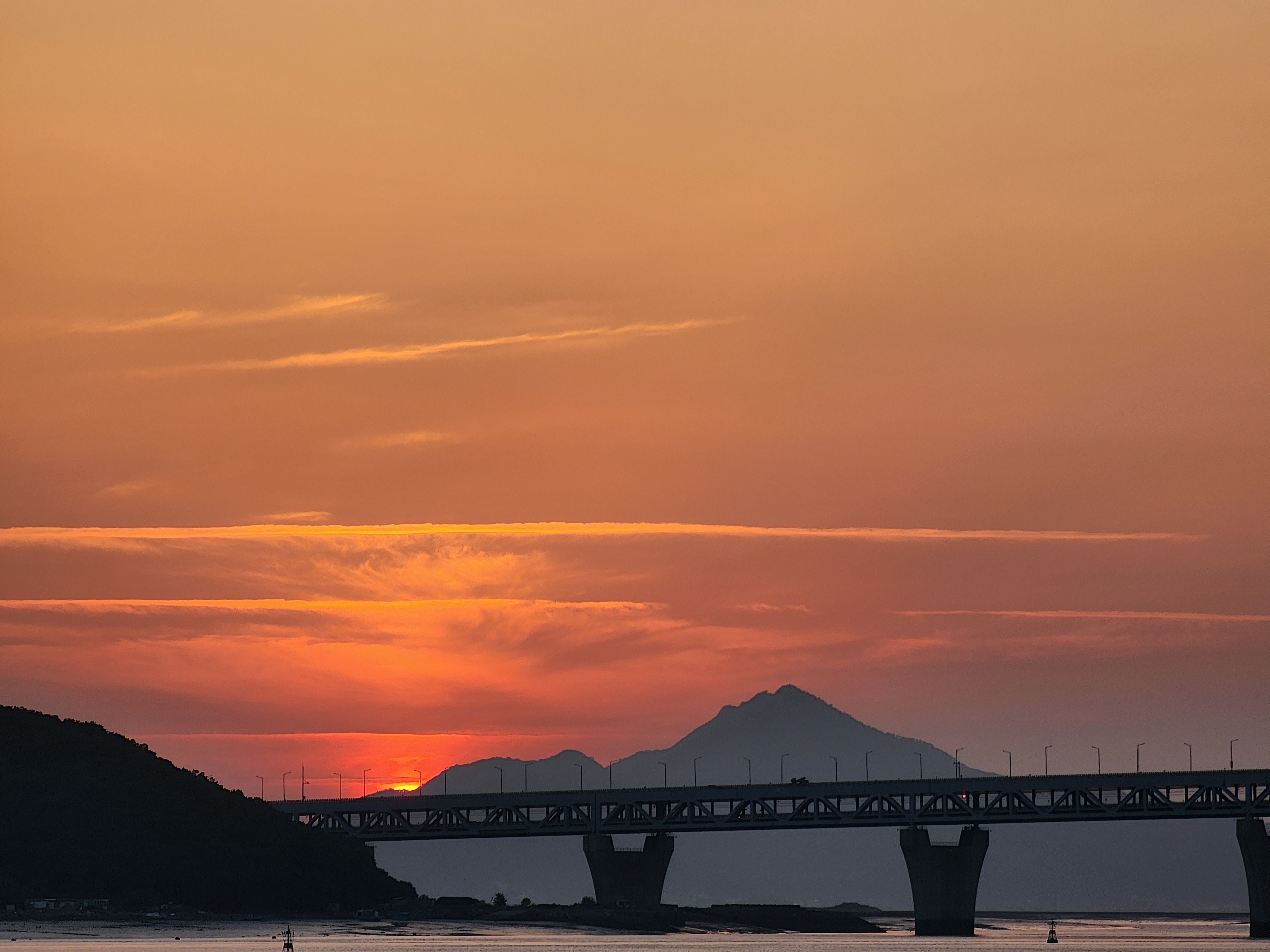 구름이 서해상을 마치 태극기처럼 펼치고 있습니다. 물결이 끓는 듯한 서해의 낙조 장면은 마치 둥근 원구가 검붉은 불덩이와 같이 눈에 쏙 들어옵니다. 해가 수평선 뒤로 접어들면서 큰 바퀴를 붙들며 서서히 잠기고, 먼 뒷섬들은 차츰 희미해지는 모습을 보입니다. 구름 빛도 서서히 가라앉고 섬들도 점점 그림자처럼 어둠에 잠기는데, 남기고 간 것은 환히 빛나던 수평선과 적막한 바다뿐입니다.