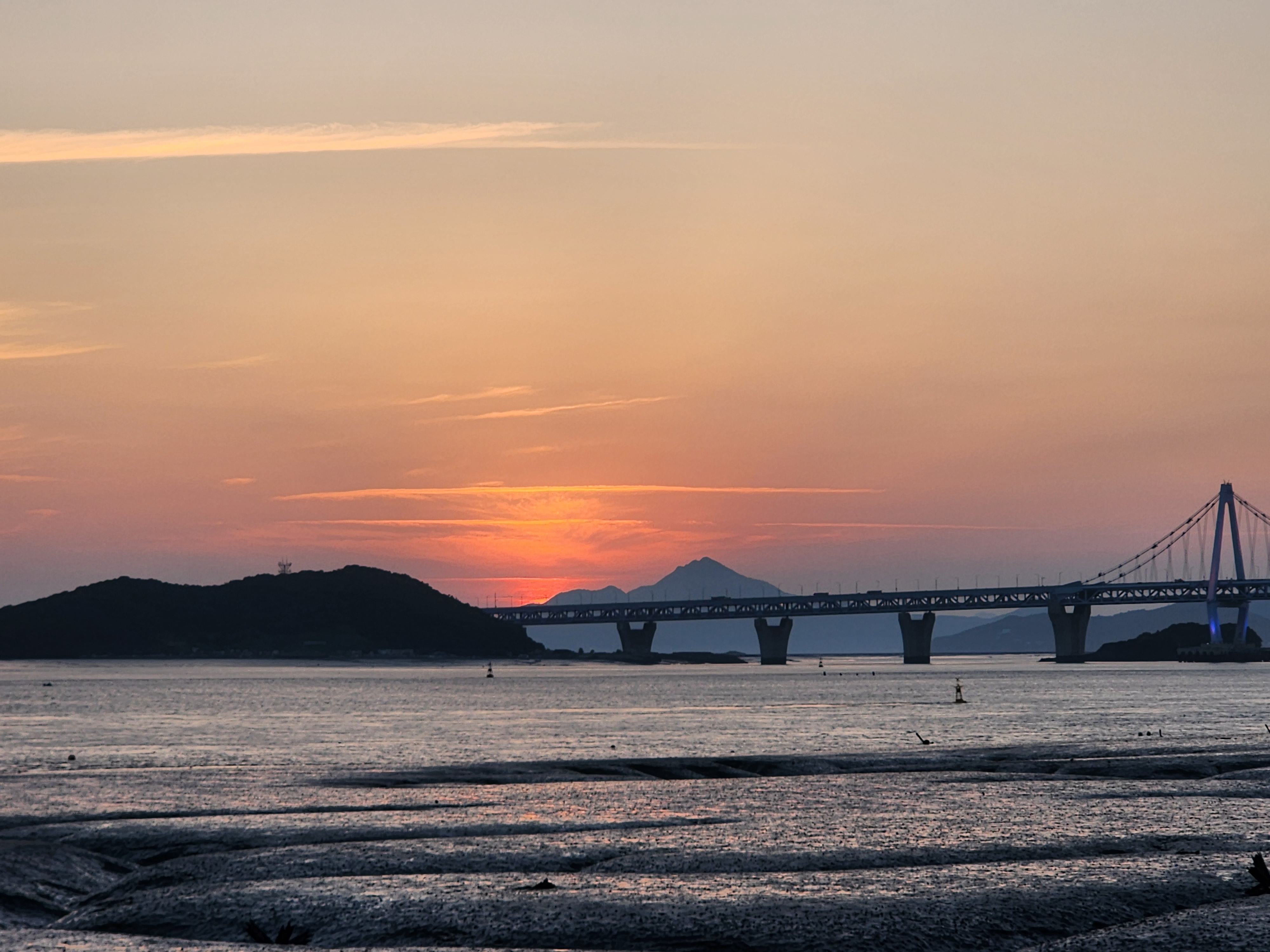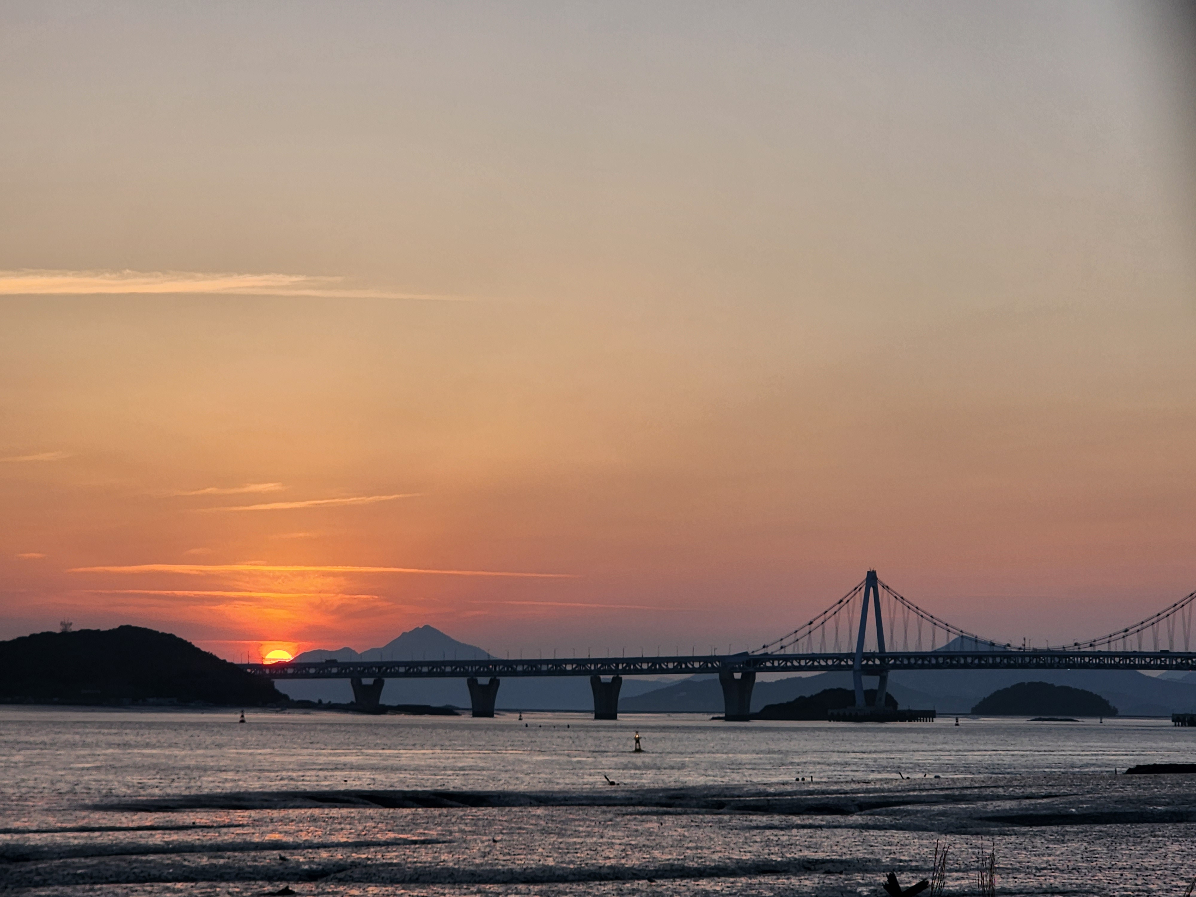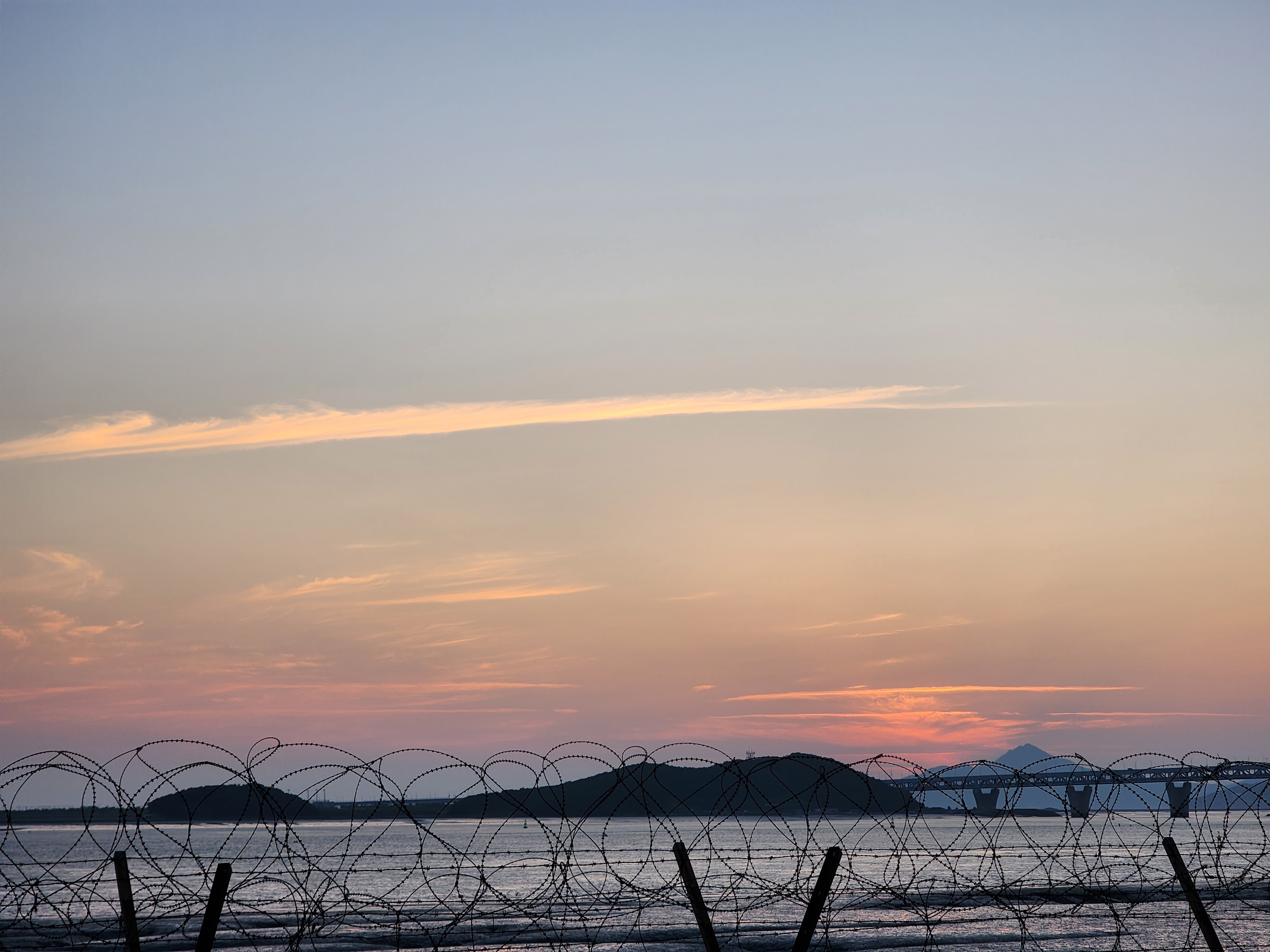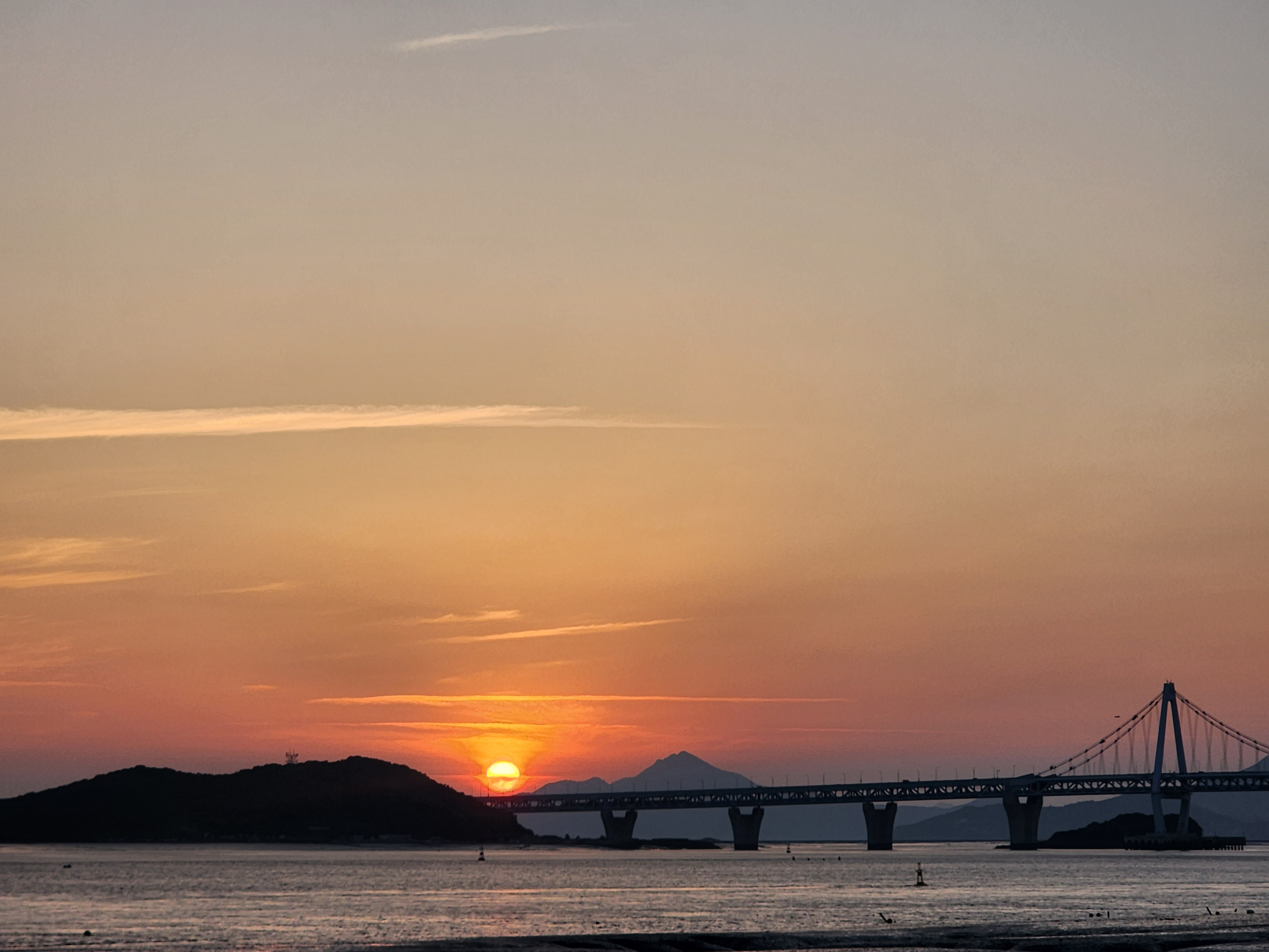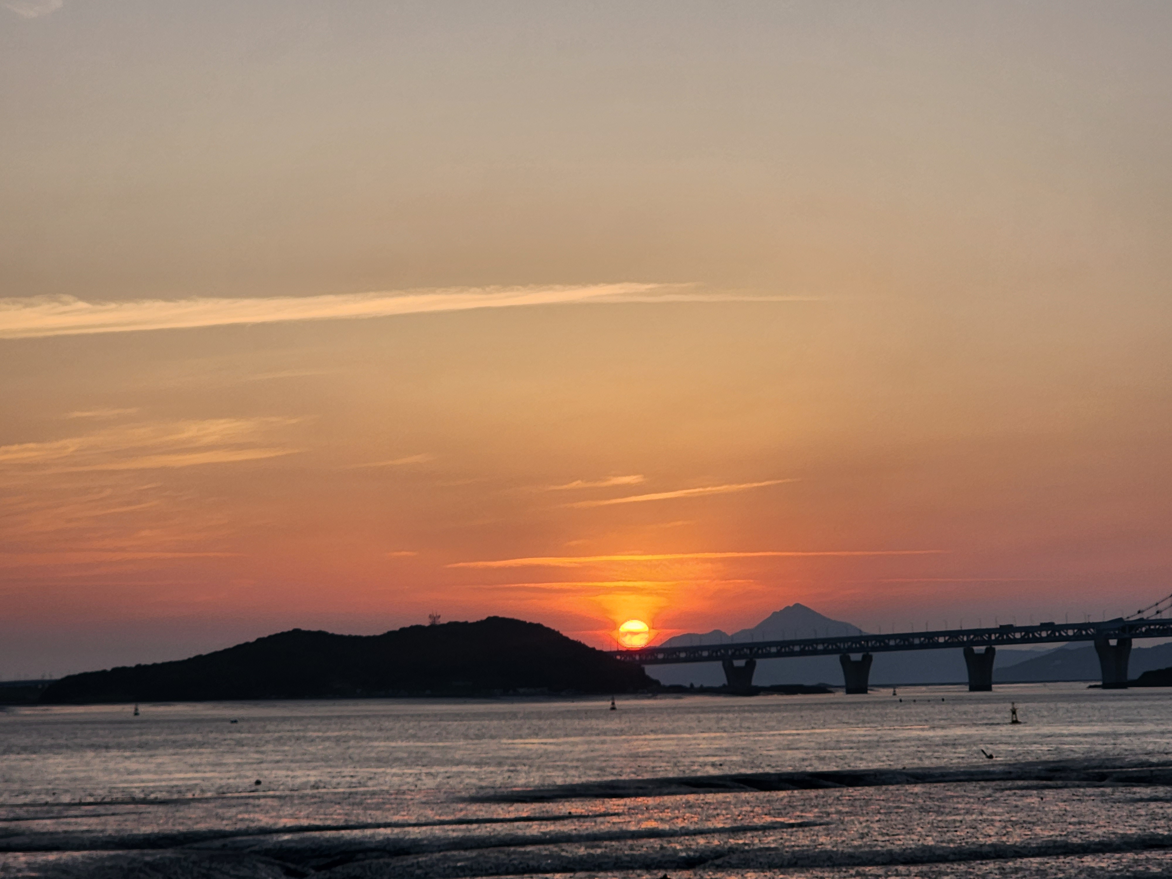 구름이 서해상을 마치 태극기처럼 펼치고 있습니다. 물결이 끓는 듯한 서해의 낙조 장면은 마치 둥근 원구가 검붉은 불덩이와 같이 눈에 쏙 들어옵니다. 해가 수평선 뒤로 접어들면서 큰 바퀴를 붙들며 서서히 잠기고, 먼 뒷섬들은 차츰 희미해지는 모습을 보입니다. 구름 빛도 서서히 가라앉고 섬들도 점점 그림자처럼 어둠에 잠기는데, 남기고 간 것은 환히 빛나던 수평선과 적막한 바다뿐입니다.