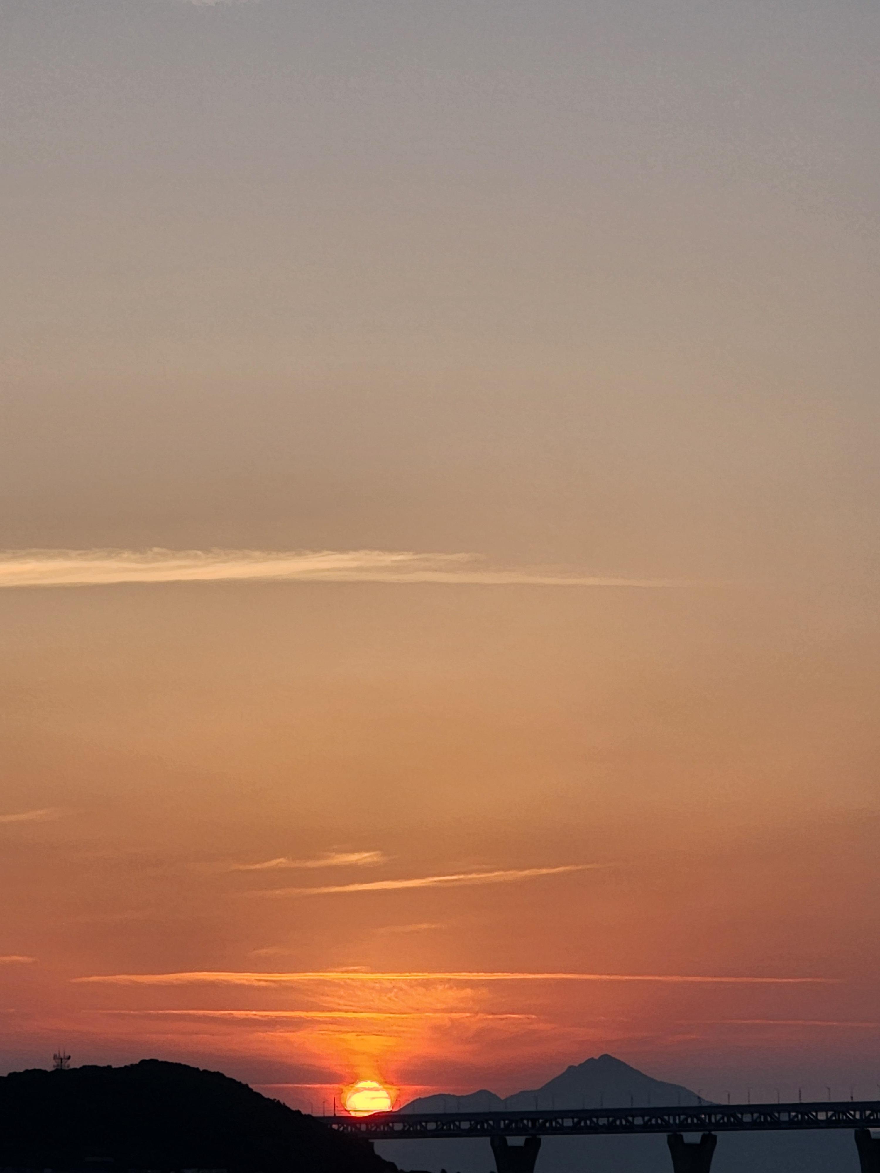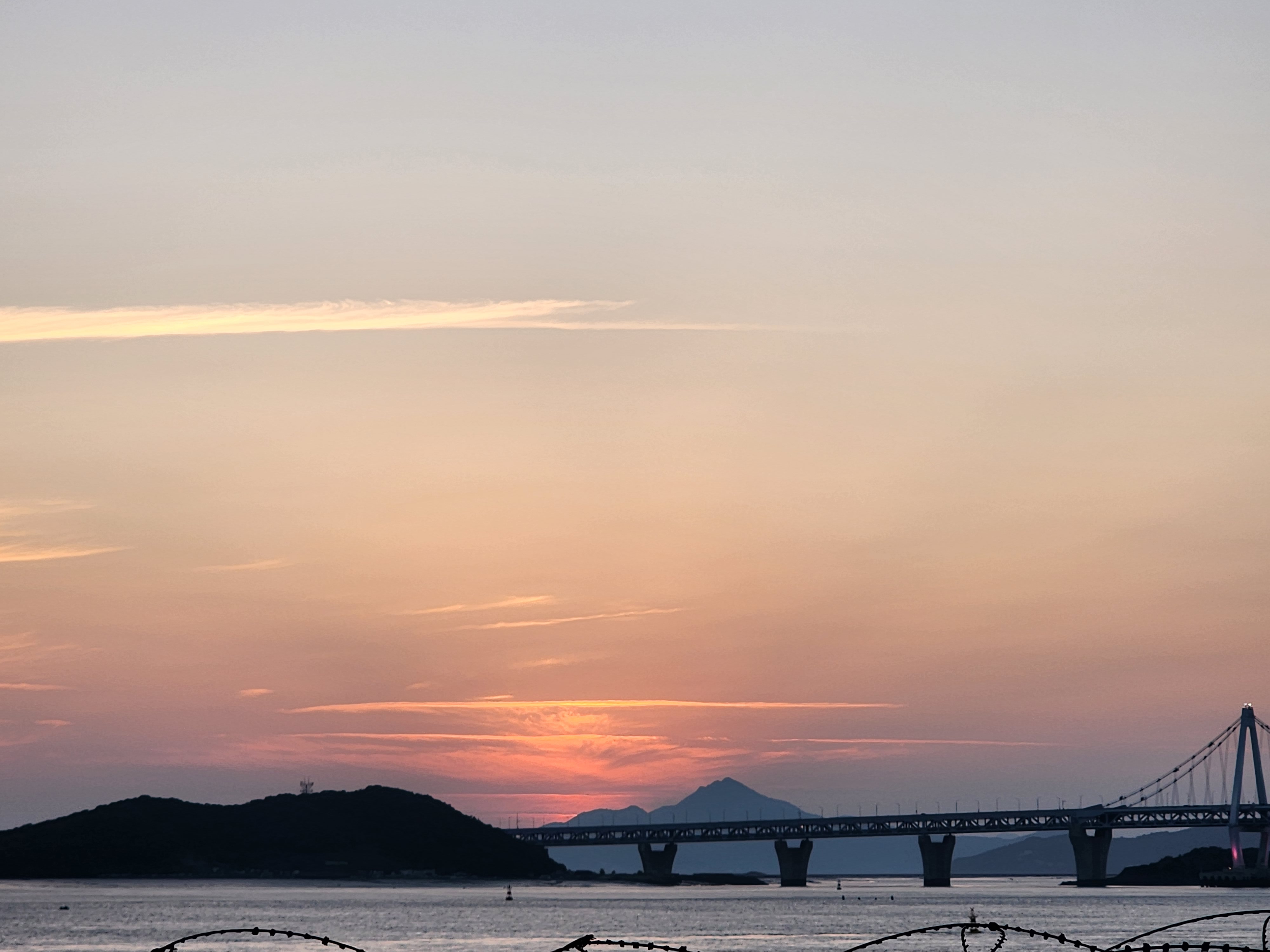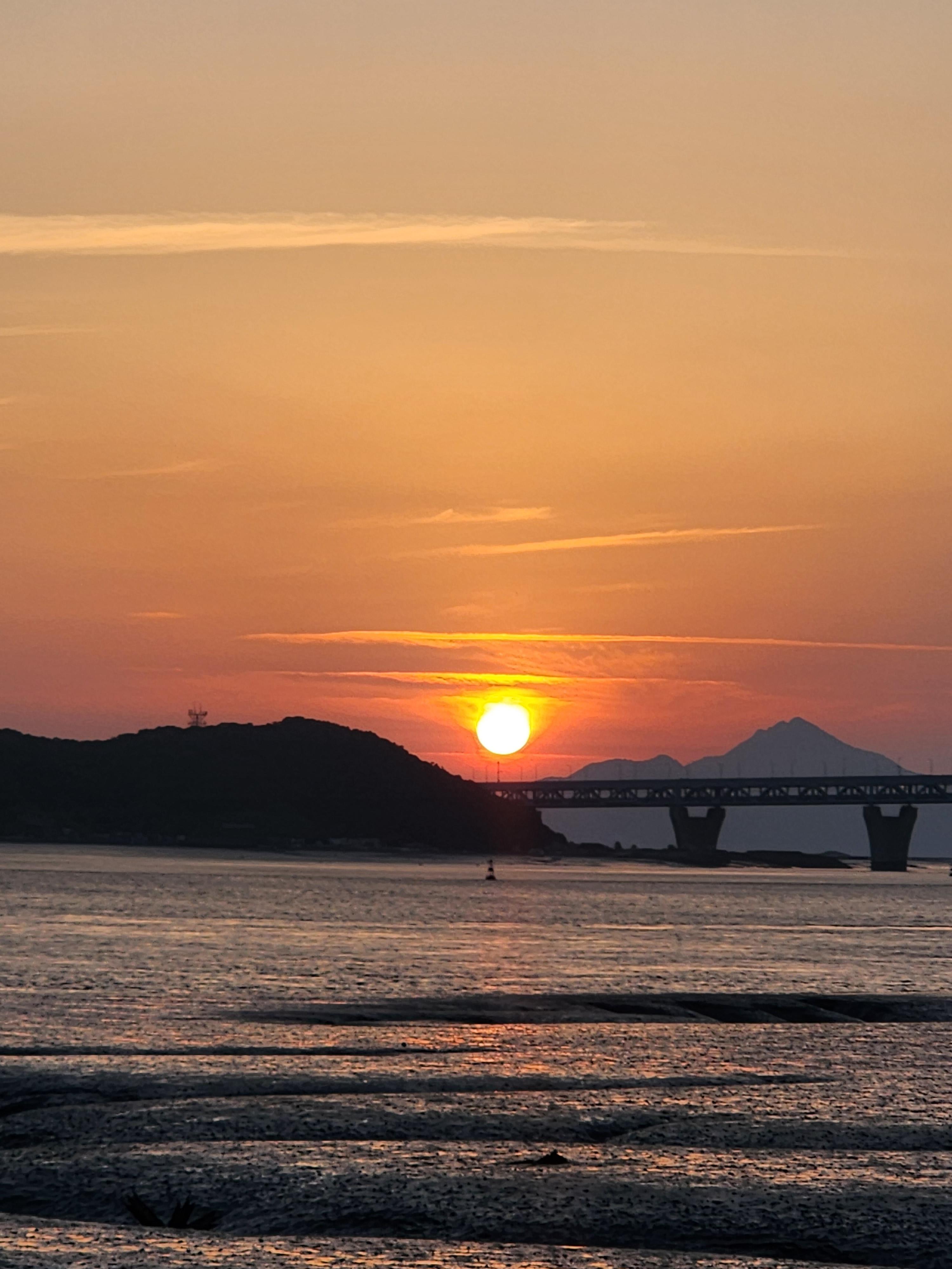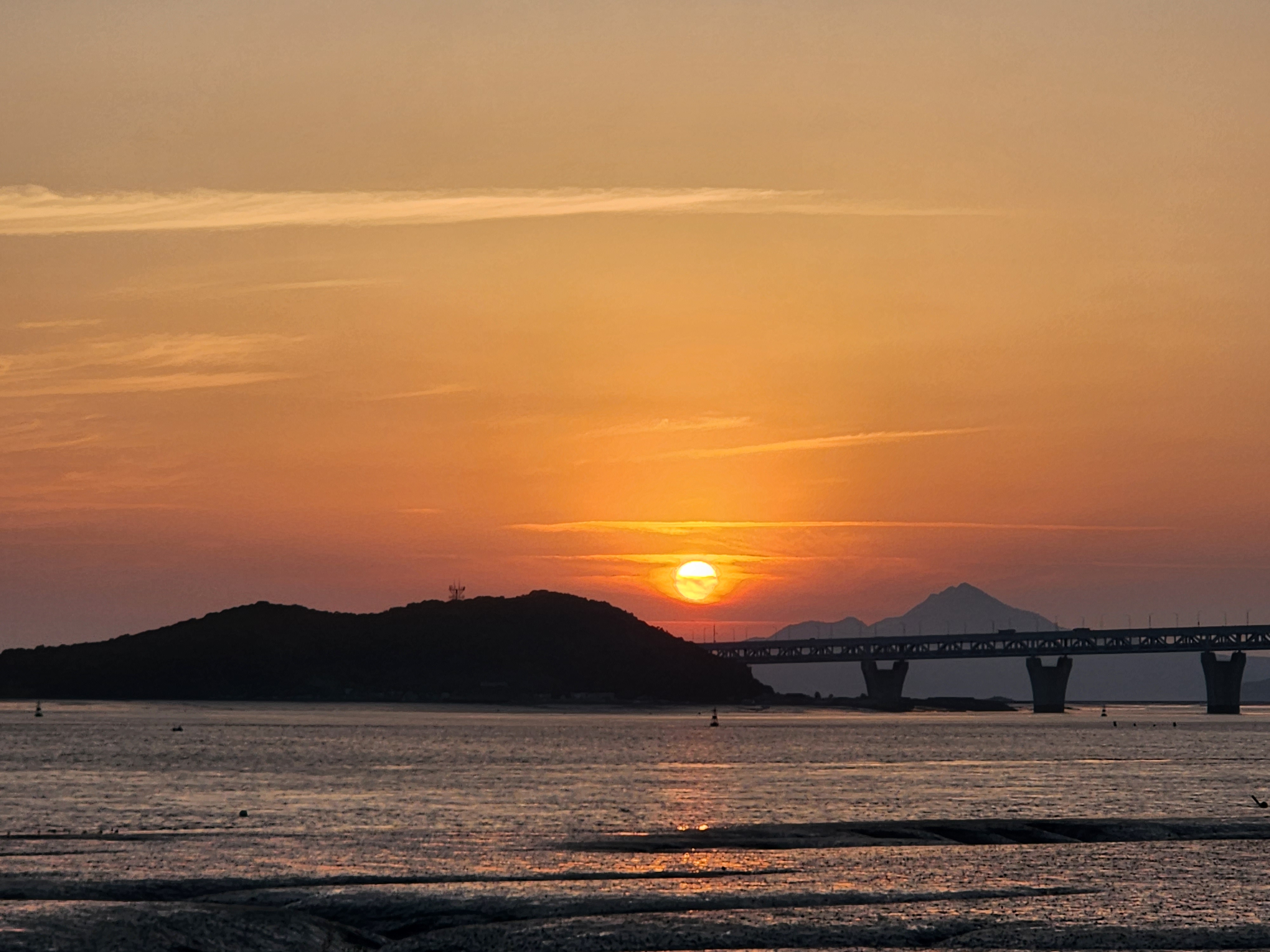 구름이 서해상을 마치 태극기처럼 펼치고 있습니다. 물결이 끓는 듯한 서해의 낙조 장면은 마치 둥근 원구가 검붉은 불덩이와 같이 눈에 쏙 들어옵니다. 해가 수평선 뒤로 접어들면서 큰 바퀴를 붙들며 서서히 잠기고, 먼 뒷섬들은 차츰 희미해지는 모습을 보입니다. 구름 빛도 서서히 가라앉고 섬들도 점점 그림자처럼 어둠에 잠기는데, 남기고 간 것은 환히 빛나던 수평선과 적막한 바다뿐입니다.